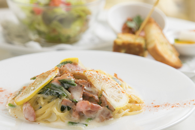 メインを選べるランチセットもオススメです。写真は、ベーコンとほうれん草のレモンクリームパスタ(一例)