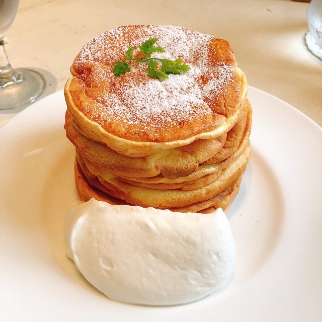 ほわほわのパンケーキ!運ばれてきて大きくて一瞬驚くのですが、卵くさくなく、重たくないので意外な程ペロリといけます。しかも胃もたれない。笑 添えられたクリームも甘すぎず美味し(o^^o)