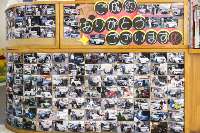 びっしりと貼られた納車時の成約記念写真。満足気な笑顔が並び、納得のお買い物を証明します!