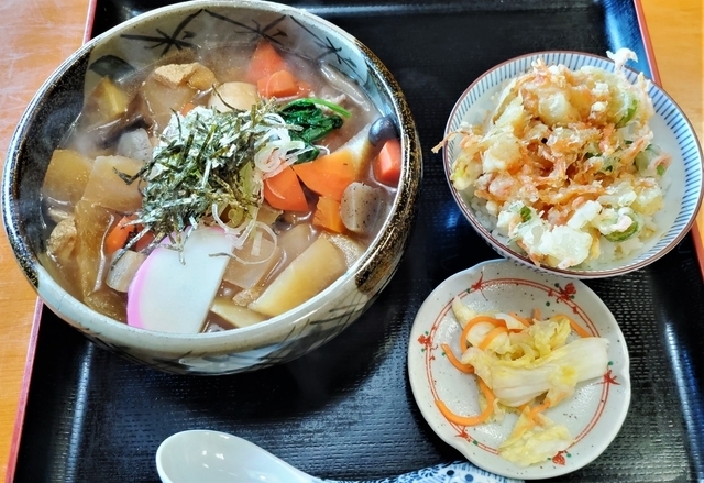 【けんちんそば+ミニかき揚げ天丼】 ふじしめさんのけんちんそばは、具材の量が多く、特に大根やにんじんがたくさん入っています。 その他にも、里芋や芋がら、こんにゃく、ゴボウなども入っていて食べ応えあり、そばもおいしかったです。(900円) 今回はセットメニューにして、ミニかき揚げ天丼を付けました。かき揚げは野菜でした。 セットメニューは、+300円で、ほかに、ネギトロ丼、イクラ丼、カレーライスがあります。