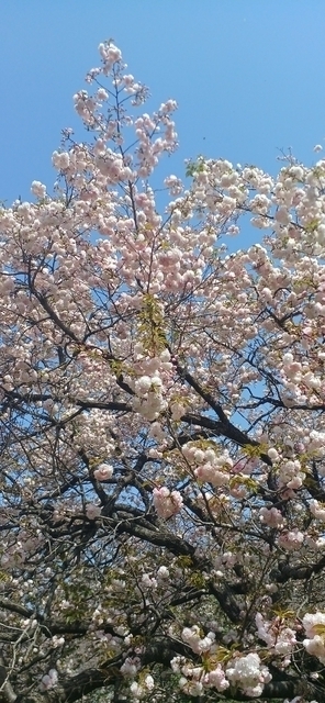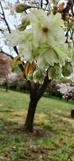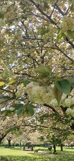 今日は、4月21日(月)の平日です。1年ぶりに、桜を見に来ました。平日ですが、自分も含め年寄りが、けっこう見に来ていました。毎年のことですが、緑の花を咲かせるウコンの桜を、見ることが目的です。でも、他にもいろんな八重桜が咲き、とてもきれいでした。また1年がんばれそうです。