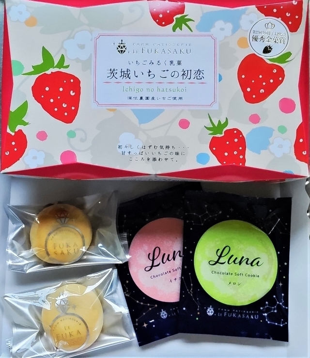 ここでは、『バウムクーヘン』以外のおすすめのお土産があります。 『茨城いちごの初恋』と『LUNA』という商品です。 いちごの初恋は、いちごジャムの入ったミルク饅頭のような商品。 茨城おみやげ大賞(旅みやげ部門大賞)や全国菓子博覧会優秀金菓賞を受賞した商品。 6個入り1,188円。 『茨城めろんの片思い』『茨城さつまいもの出逢い』という商品もあります。 どの商品もバラで購入できるとうれしいです。 LUNAは半生菓子のソフトクッキーで、メロン、いちご、プレーンの3種類あります。 この商品は、茨城おみやげ大賞金賞を受賞した商品。 バラで購入することができ、1枚162円。