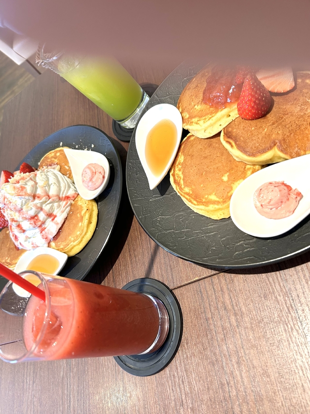 行列に並んでメロンパフェを食べたくて 行きましたが、いちごの季節でした。 いちごバターパンケーキと濃いメロンジュースをいただきました。