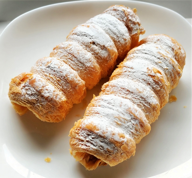 【パイコルネ】 筒状のパイ生地の中にカスタードクリームが詰まっているお菓子です。 中のクリームは、カスタードのほか、チョコもありました。 サクサクとした生地で、カスタードクリームは甘さ控えめです。 両端はクリームが入っていないので、たっぷり入れてくれるとありがたいです。 1本280円。(長さ約12~13cm)