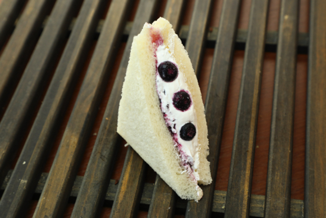 ジューシーなブルーベリージャムとふんわりホイップ、隠し味のまろやかでコクのあるムースチーズがおいしいフルーツサンドです!
