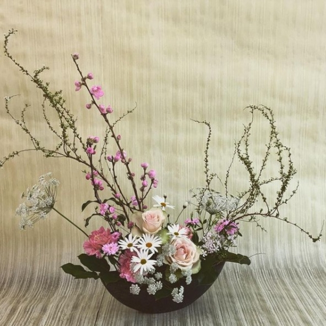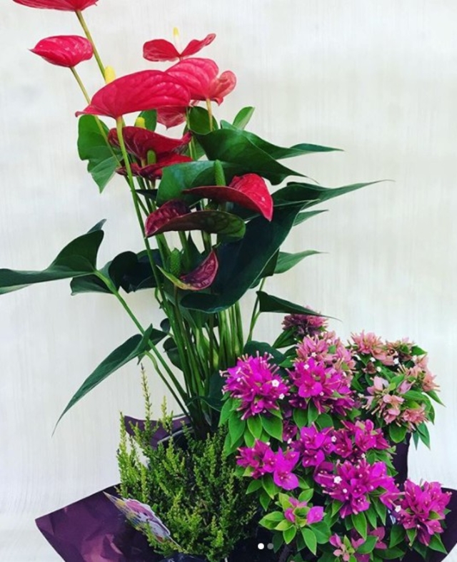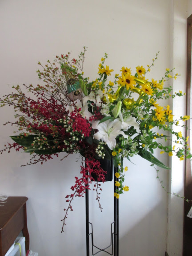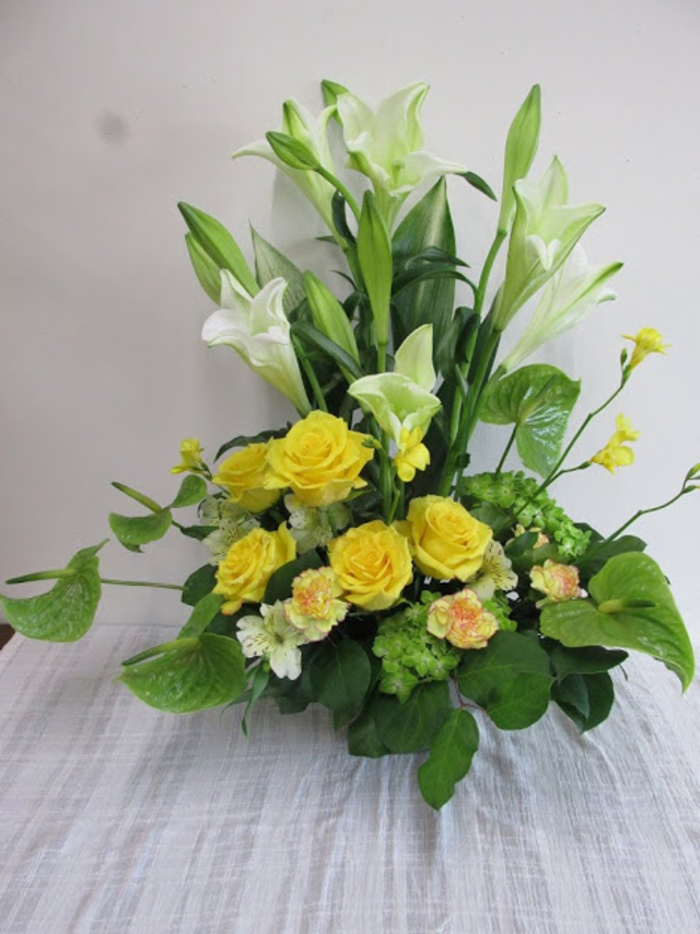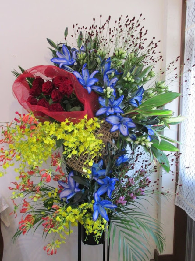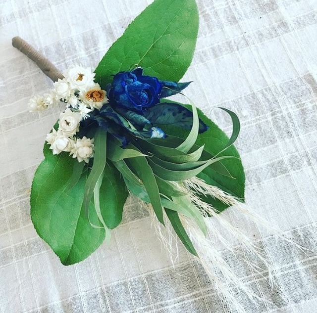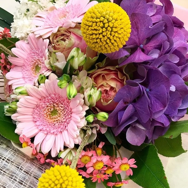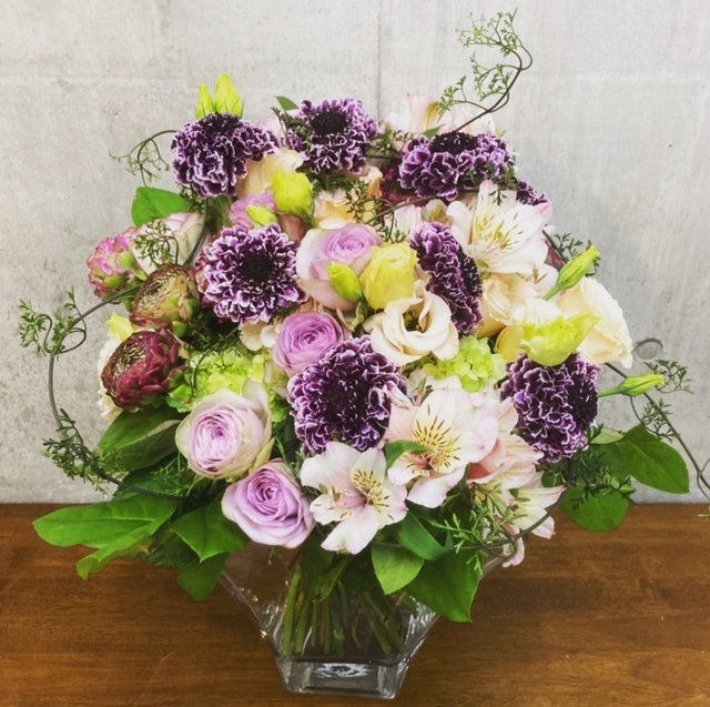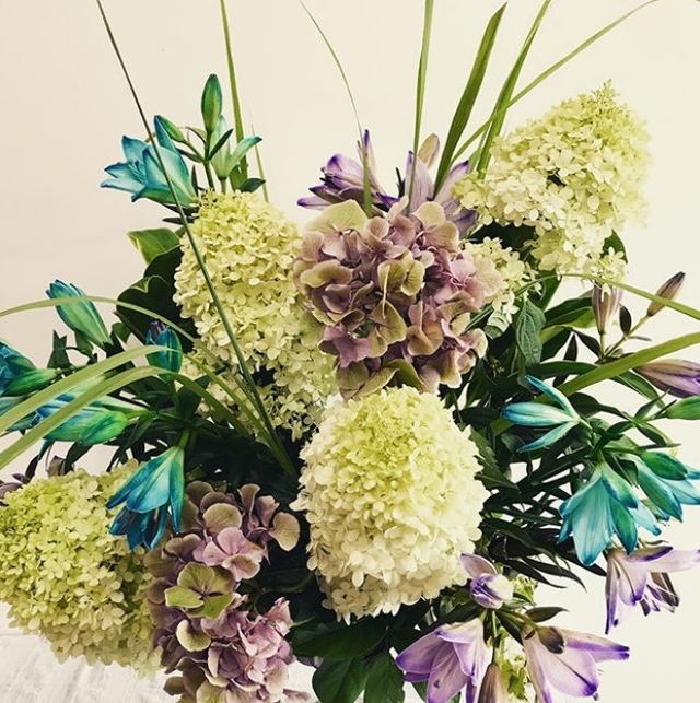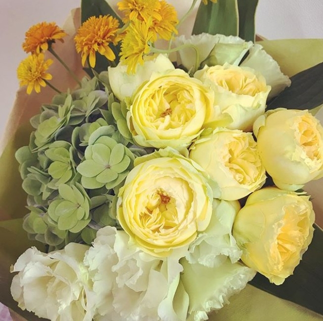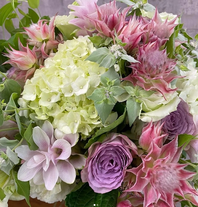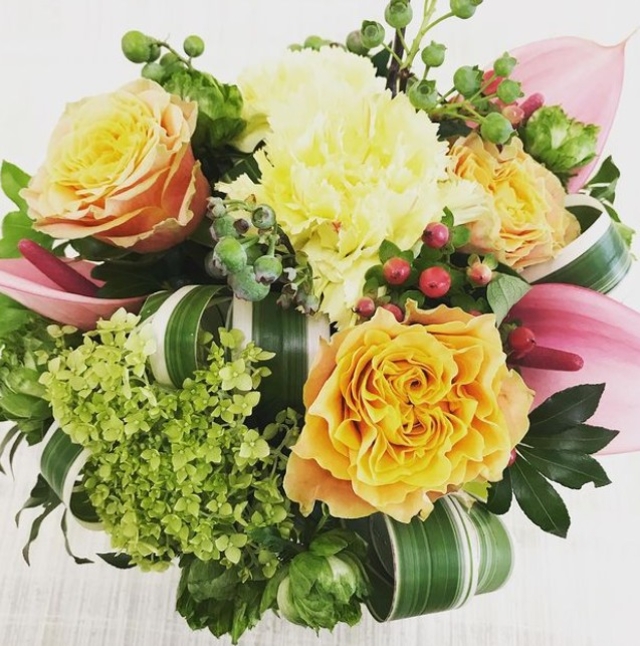 季節を感じるブーケ♪バラ・キャロットオレンジ・アンスリウム・サビア・あじさい・グリーンアナベル・ブルーベリー・ヒペリカム・キキョウラン・緑一色・馬酔木