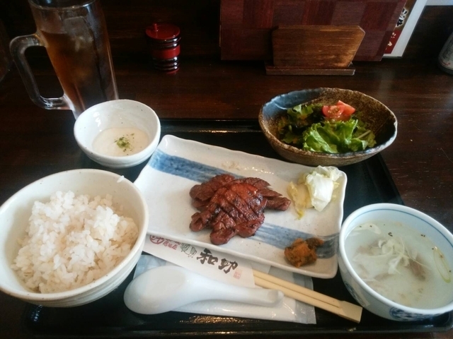 ビル2Fにあるこちらへ土曜ランチに初めて訪れました。店内は卓子席と個室席があり、空いているせいか個室の卓子席へ。ランチメニューで一番お勧めの名物牛タン焼き定食(1人前)を注文しました。到来した平膳上の主皿には、味噌でなく塩で味付けした焼き牛タンが細かくカットとされて載っており、青唐辛子の味噌漬に白菜浅漬が添えられています。これに麦ご飯、あおさ粉をかけたとろろ、テールスープ(具はテール肉にネギ・黒胡椒)が付きます。さっぱりしたタン塩は美味しいですが、特にテールスープはテール肉とともにスープの旨味がよく出ていてとても美味でした。